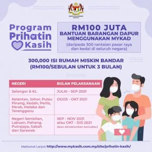 Manakala, bagi mereka yang beralamat di Sabah, Sarawak, Labuan, Negeri Sembilan, Pahang dan Putrajaya – pembayaran PRIHATIN KASIH akan disalurkan sehingga Disember 2021.