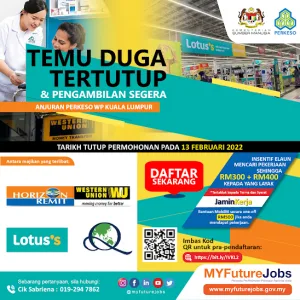 Berita baik kepada yang sedang mencari pekerjaan, Pertubuhan Keselamatan Sosial (PERKESO) Wilayah Persekutuan Kuala Lumpur akan menganjurkan program Temu Duga Tertutup bagi mengisi pelbagai kekosongan jawatan yang ditawarkan.